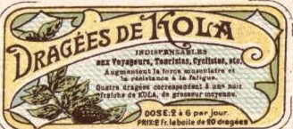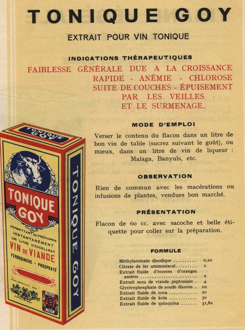 Comme nous l’avons vu dans une exposition précédente, les vins médicinaux ont rencontré au XIXème et XXème siècle un succès considérable. Plusieurs d’entre eux incorporaient de la caféine tels que l’Heptyl Bourdou, la crème de Kola Gallien, l’élixir de Kola Barbier, le Kola Monavon (Elixir, Vin), Le kola Saint Louis, le Samo Kola, le vin de Kola Saint Pierre, le Vin Bravais, le vin Dallier, le Vin de Kola Delta, le vin du Dr Jhames, le Vin de Dr Rogé, le Vin Ecalle, le vin Oxygéne Panchèvre, le vin Pelletier Tonique, le vin Tonique Fortifiant, le vin Voguet, etc. C’était également la cas du fameux Vin Désiles