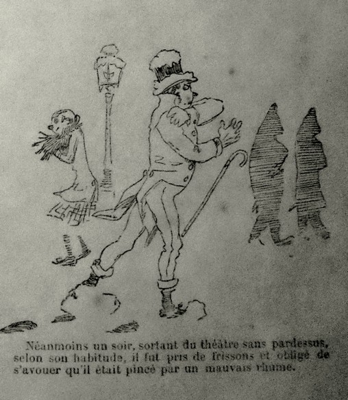 | M. Poumonfort était l’homme le mieux portant qu’on puisse imaginer. Il narguait la maladie et passait des journées entières en caleçon, scandalisant même des canotières d’Asnières par la légèreté de son costume. | Par les temps les plus abominables, alors qu’il neigeait et gelait à pierre fendre, il se donnait le luxe de monter sur l’impériale des omnibus et s’éventait même, au grand ahurissement des passants. | Néammoins un soir, sortant du théâtre sans pardessus selon son habitude, il fut pris de frissons et obligé de s’avouer qu’il était pincé par un mauvais rhume. | ||
