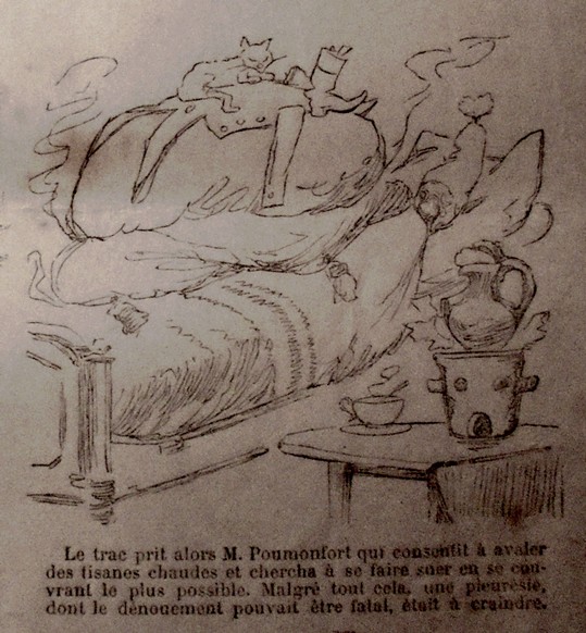 | Le rhume augmentant lui tomba sur la poitrine, comme disent les bonnes gens, et cela malgré toutes les chandelles qu’il se fourra dans le nez. Deux jours après une bronchite se déclara bel et bien. | Eternuant à en casser les vitres et à renverser les meubles, M. Poumonfort se coucha très ennuyé, mais déclara ne vouloir prendre aucun remède, malgré les objurgations de son concierge | Le trac prit alors M. Poumonfort qui consentit à avaler des tisanes chaudes et chercha à se faire suer en se couvrant le plus possible. Malgré tout cela, une pleurésie dont le dénouement pouvait être fatal, était à craindre. | ||