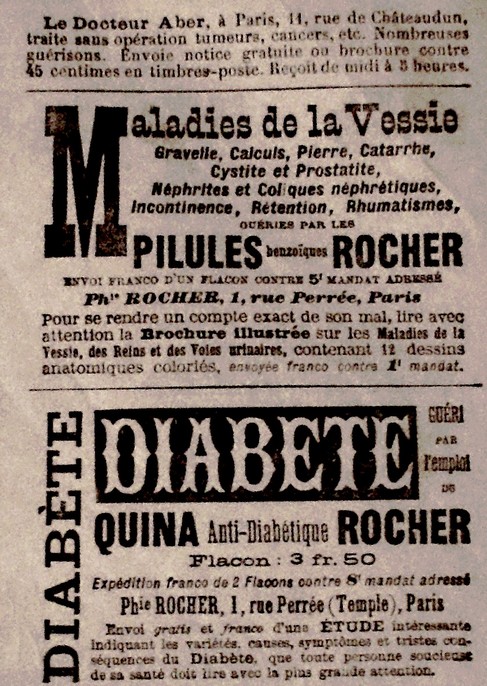 On voit aussi à nouveau les pilules Rocher et le Quina Rocher pour le diabète. Nous n’avons pas retrouvé d’informations précises sur la pharmacie ROCHER ni sur le Baume Pinaud. |