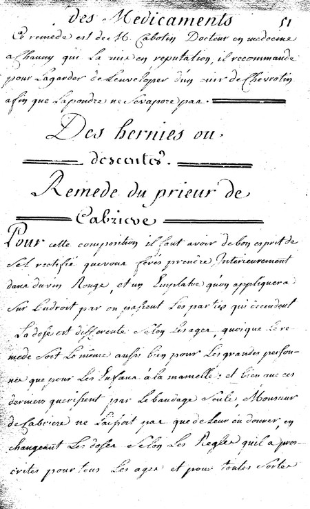 Cataplasme pour les hernies. Recette : fleurs de camomille, de melilot et leurs feuilles que l’on hachera menu pour les fricasser avec de la bouze de vache et ensuite l’appliquer sur le mal et soutenir d’un bandage. Emplâtre pour les hernies. Recette : des fromigeons, une bonne poignée; six branches de menthe. Faite bouillir le tout avec du lait et une piognée de farine de seigle, pour en faire un emplâtre que l’on appliquera le plus chaud qu’il sera possible, soutenu d’un bon bandage.