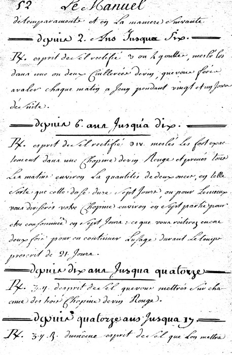 Remède n°80 Recette : Esprit de sel rectifié, 3 ou 4 gouttes. mêmez les dans une ou deux cuillérées de vin, que vous ferez avaler chaque matin à jeun pendant vingt et un jours de suite. Depuis 6 ans jusqu’à dix. Remède n°81 Recette : Esprit de sel rectifié, quatre gros. Mêlez les fort exactement dans une chopine de vin rouge et prenez tous les matins environ la quantité de deux onces, de telle sorte que cette dose dure sept jours, ou pour le mieux, vous divisez votre chopine environ en sept parties pour être consommées en septe jours : ce que vous réitérez encore deux fois pour en continuer l’usage durant le temps prescrit de 21 jours.