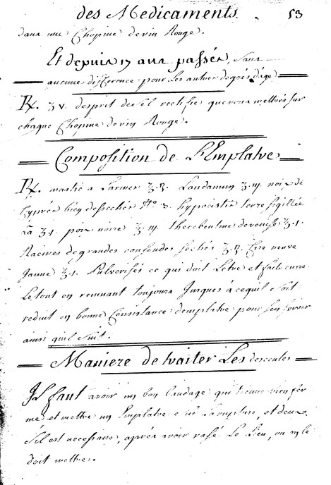 Remède n°83 Recette : Une demi-dragme et demi (?) d’esprit de sel que vous mettrez sur chacune des trois chopines de vin rouge. Et Depuis 17 ans passés, sans aucune différence pour les autres degrés d’âge. Recette: Cinq dragmes d’esprit de sel rectifié que vous mettrez sur chacune chopine de vin rouge. Composition de l’emplâtre (n°85). Recette : Mastic à larmes, une demi-once; laudanum, trois dragmes, noix de cyprès bien desséchée n°3; hypociste, terre sigillée, une dragme de chaque; poix noire, trois onces; térébenthine de Venise, une once; racines de grandes consondes séchées, une demi-once; cire neuve jaune, une once; Pulvérisez ce qui doit l’être et faites cuire le tout en remuant toujours jusqu’à ce qu’il soit réduit en bonne consistance pour s’en servir ainsi qu’il suit. Manière de traiter les descentes. Il faut avoir un bon bandage qui tienne bien ferme et mettre un emplâtre sur xxxx et deux s’il est nécessaire, après avoir rasé le lieu où on le doit mettre. |