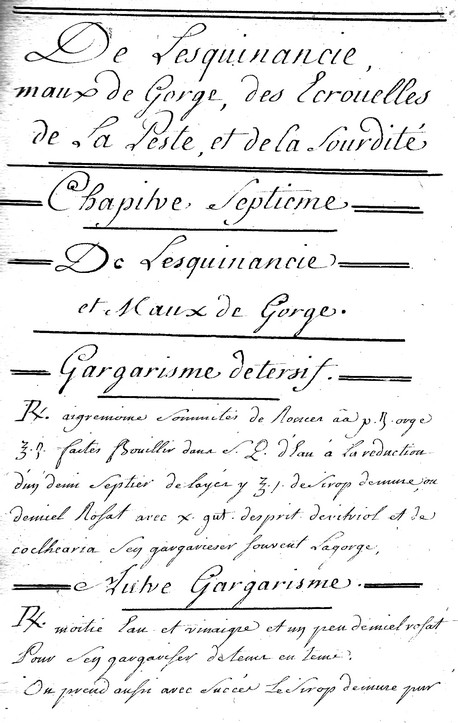Recette : Cannelle, un demi-septier, que vous concassez pour la mettre(à) infuser avec trois chopines de bon vin blanc et une chopine d’eau (de) roses, mettant le tout dans un vaisseau bien bouché pour les laisser infuser à froid pendant trois à quatre jours; ensuite, on fera distiller au bain-marie pour s’en servir, dans l’esquinancie à la dose d’une cuillérée ou deux dragmes et demi. On l’emploie contre toutes sortes de vertiges, maux de têtes, paralysie, difficulté d’uriner, douleur d’estomac, défaillance de coeur, convulsions (?), colique ventreuse, suffocation de matrice et indigestion.