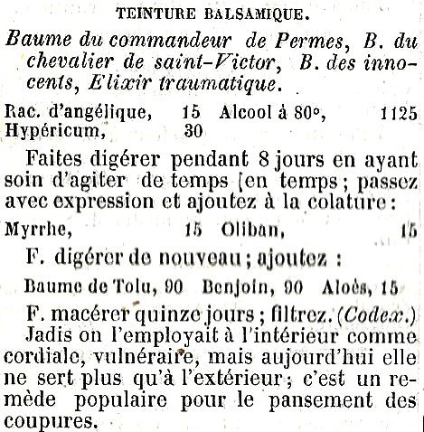 Le plus souvent, l’alcool était mis en contact avec des végétaux. On trouve par exemple la teinture d’absinthe, la teinture d’acore aromatique, la teinture d’aloès, etc. On pouvait également réaliser des teintures à partir d’animaux comme les teintures de cantharide ou de cochenille. Mais il était également possible d’utiliser des minéraux : teinture d’antimoine, teinture de fer muriatique, teinture de Mars de Ludovic (à base de sulfate de fer), et bien sûr la teinture d’iode qui survivra à toutes les autres. Dorvault en 1844 considérait que les teintures étaient des médicaments précieux car elles permettaient de conserver très longtemps les substances actives. L’alcool y agit comme solvant, mais aussi comme conservateur, et il ajoute ses propriétés à celles de la matière médicamenteuse. Il existait également des teintures éthérées (ou étherolés) qui se préparaient au moyen de l’éther sulfurique ou d’éther acétique (découvert en 1750 par Lauraguais). Certaines teintures ont donné lieu à des écrits intéressants comme ce que rapporte Guibourt dans sa Pharmacopée de 1834 à propos de la teinture de Bestuchef. En 1728, le chimiste Lembke, par qui le comte Bestuchef faisait préparer sa teinture, s’enfuit de chez lui et se retira à Hambourg, où il vendit le secret de sa teinture au général de la Mothe, qui lui-même la fit connaître en France sous le nom de gouttes d’or, et qui en préparait deux sortes : les gouttes jaunes et les gouttes blanches. Ces remèdes connurent une grande vogue au XVIIIe siècle. Dès 1790, Baumé en donne le mode de préparation dans ses Eléments de Pharmacie théorique et pratique mais conteste la présence d’or dans le produit final. Guibourt pensait, quant à lui, que les gouttes d’or du général de la Mothe contenaient réellement de l’or initialement mais n’ont finalement plus contenu que du mercure (comme le montrera la commission des remèdes secrets de 1810). La préparation des gouttes d’or ne demandait pas moins de 35 opérations pharmaceutiques.