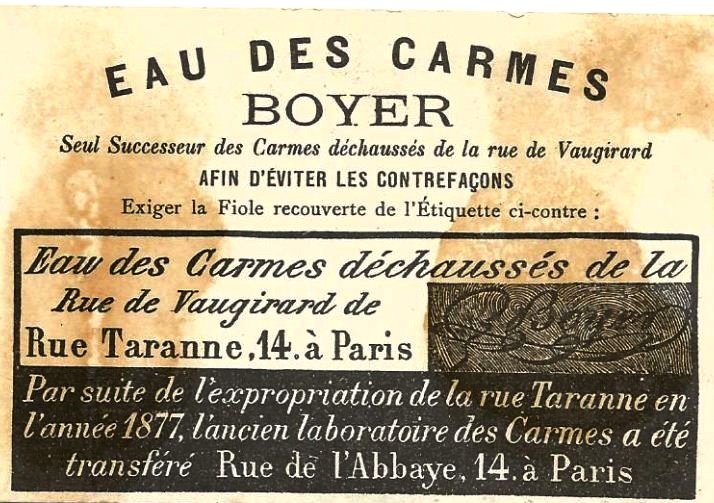 Les Carmes firent breveter leur produit par lettres patentes de Louis XIV en 1709, renouvellées en 1776 par Louis XV. Pendant la Révolution, après une période troublée, les moines, constitués en Société civile, continuèrent d’exploiter leur élixir. Sous l’Empire, un décret de 1806 confirma l’autorisation de vente. En 1831, le dernier Carme, le frère Paradis, céda la formule magique à Monsieur BOYER qui lui accola son nom. La fille de M. Boyer épousa Renouard-Larivière, propriétaire du « Bon Coin », l’un des Grands Magasins de nouveautés qui virent le jour sous la Monarchie de Juillet. Les magasins de Monsieur Boyer étaient situés rue Taranne, aujourd’hui démolie à la suite des travaux d’Haussmann. Les bureaux de Boyer vont alors être transférés rue des Lombards, puis 6 rue de l’Abbaye où la société exploitante existe toujours. De son côté, la production se transporta à Courbevoie, 6 rue Rouget de L’Isle, jusqu’en 1990, puis à Carrières sur Seine. La formule de l’Eau de mélisse des Carmes Boyer associe plusieurs plantes : angélique, mélisse, cresson, girofle, coriandre, muscade, cannelle, citron. Le tout concocté grâce à un tour de main unique. |