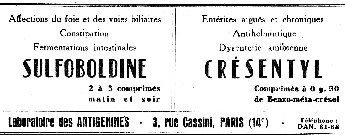 Ils sont installés en 1929, 4 place Lucien-Herr à Paris V°. Ils fabriquent une gamme de vaccins curatifs les Antigénines utilisés sous forme orale, hypodermique, d’ovules, d’instillation nasales, , de bouillons pour les pansements.
