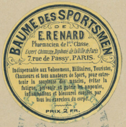 On peut lire que leurs produits sont destinés aux militaires, vélocipédistes, chasseurs, canotiers, alpinistes, etc., et combattent la fatigue. Très rapidement, d’autres marques sont déposées par un pharmacien de Paris, E. Renard : le « Baume des Sportmen » et le « Sportmen Kola. » Il faut se rappeler que le vélo devient très à la mode dans cette fin de XIXe siècle et que les termes vélocipédistes et velocemen sont alors couramment utilisés plutôt que cyclistes. Ernest Théotime Renard (1855-1922) était pharmacien de 1ère classe, installé à l’époque au 7 rue de Passy.
