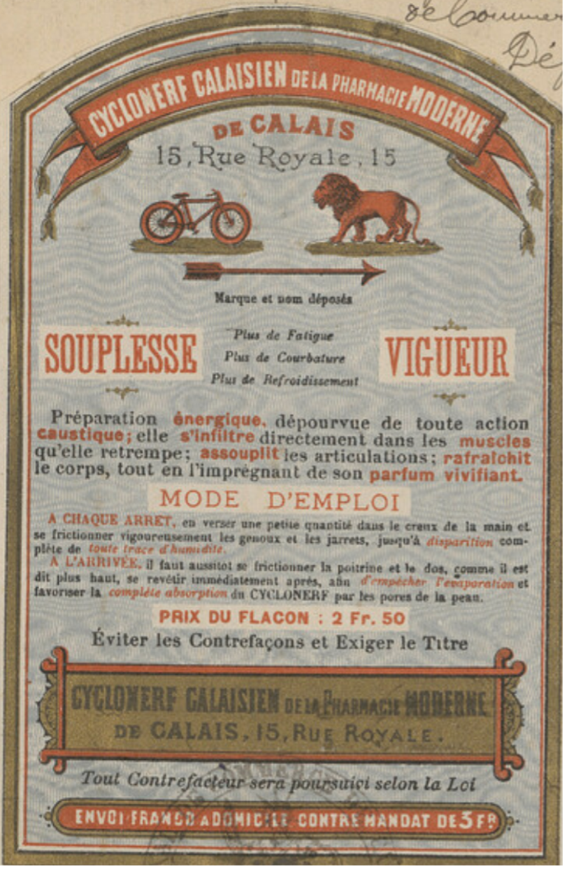 Il indique sur cette marque que « cet élixir préserve de la fatigue musculaire, supprime l’essoufflement dans la marche, évite la soif et modère la sudation. il est indispensable aux cyclistes, gymnastes et tous sportistes (sic) auxquels il permet un rendement de travail élevé sans sensation de faiblesse. « Il recommande d’en prendre avant la course et toutes les 2 à 3 heures ensuite.