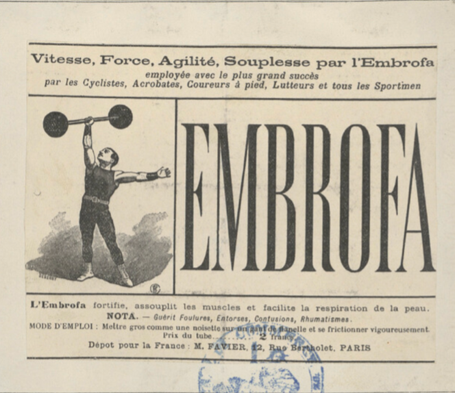 En 1903, le distillateur Etienne Brunier lance « Gym Kina » et Lucien Favier, de Paris « Embrofa » en 1904. Ce produit est « employé avec le plus grand succès par les cyclistes, acrobates, coureurs à pied, lutteurs et tous les sport’men… L’Embrofa fortifie, assouplit les muscles et facilite la respiration de la peau. NOTA : guérit foulures, entorses, contusions, rhumatismes ».