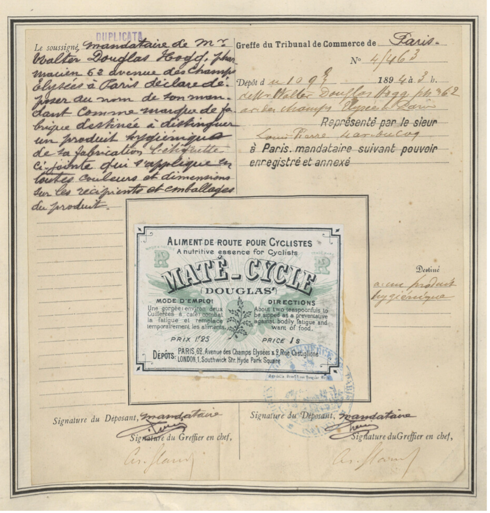 L’année 1894 est décidément une bonne année pour les marques : Antoine Nalin, de Marseille dépose « Vélocemen’s embrocation » et Recorman Peptone Kola. La même année, Douglas Hogg, le pharmacien parisien que nous avons déjà vu déposer des médicaments à base de Champagne, dépose le « Maté-Cycle Douglas » et le « Maté Champagne Douglas », deux produits destinés aux cyclistes. Le Maté-Cycle est un aliment de route pour eux (A nutritive essence for Cyclists). il faut en boire une gorgée (environ deux Cuillerées à café). Il « combat la fatigue et remplace temporairement les aliments »