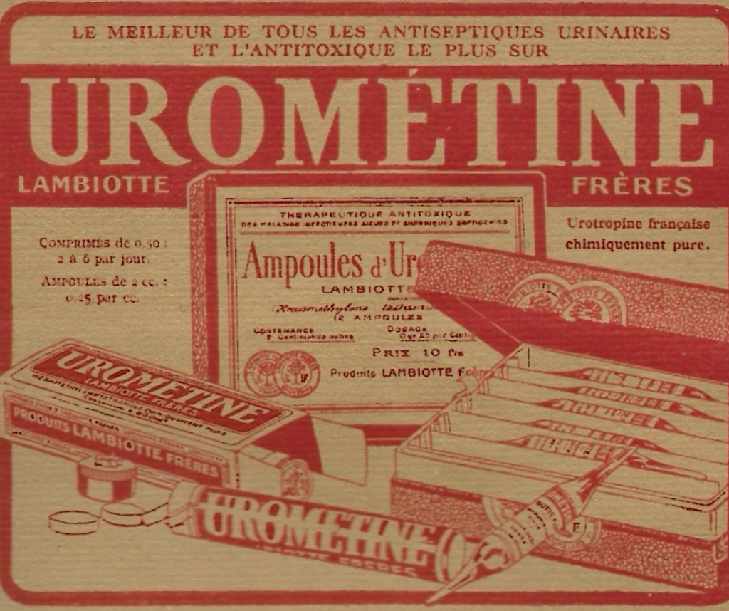 Lambiotte proposait aussi l’Urométine, « l’Urotropine française ». Lambiotte explique que « c’est au grand thérapeute Huchard que revient le mérite d’avoir mené le bon combat contre les produits pharmaceutiques allemands qui inondaient notre marché…. L’urotropine est la dénomination allemande d’un produit essentiellement français, l’hexaméthylènetétramine. Il importe donc de soutenir le produit de Lambiotte qui l’a présentée sous le nom d’Urométine.
