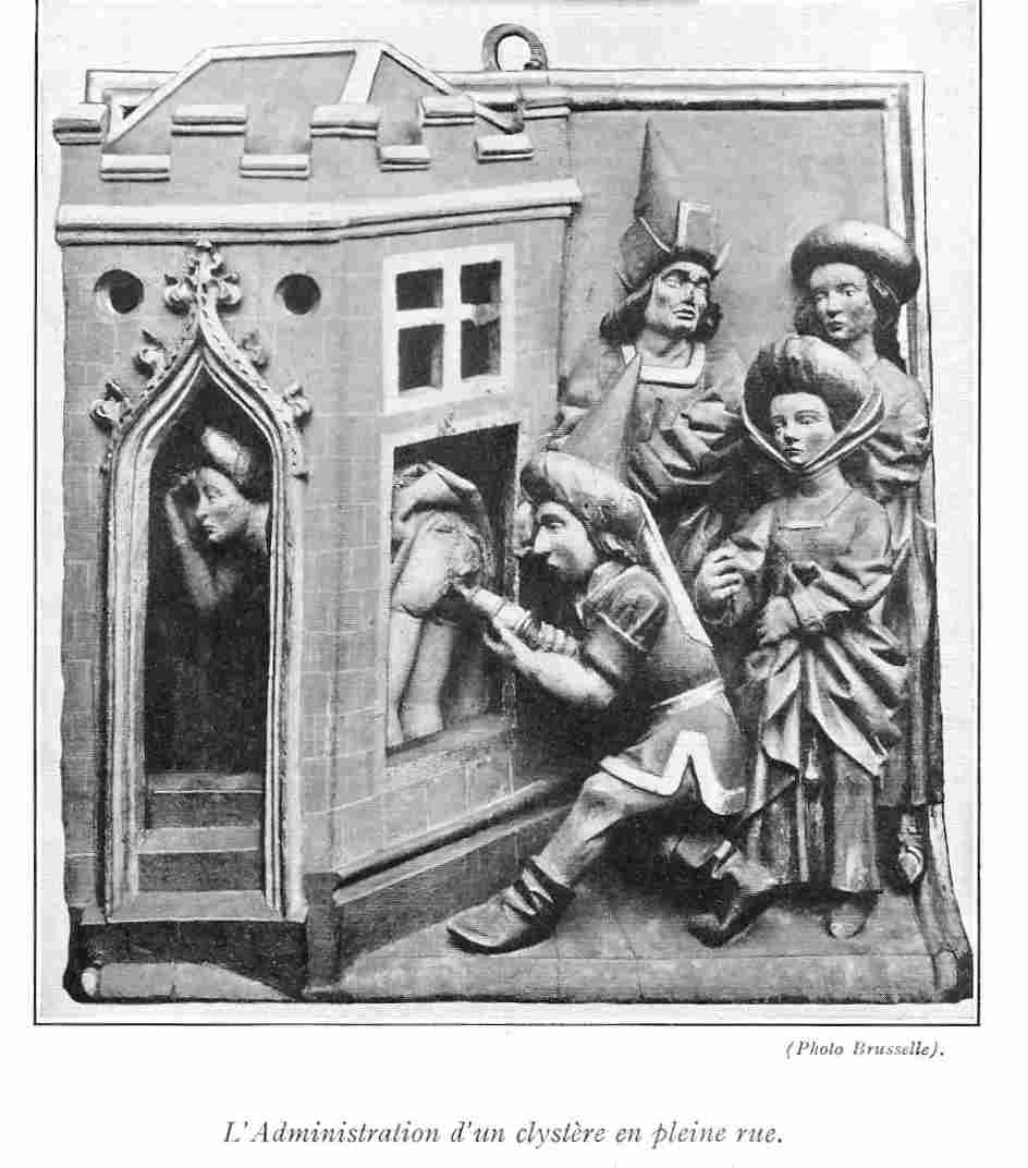 Parmi les reproductions de ce journal en 1924, on peut remarquer cette image intitulée « L’administration d’un clystère en pleine rue ». « Cette curieuse sculpture polychromée, conservée au Musée archéologique de Bruges, nous offre un curieux exemple du travail des huchiers du XVe siècle. Est-ce une semelle de poutre, ou, comme on le dit aussi, une enseigne d’apothicaire ? On n’en sait pas exactement l’origine. Quoi qu’il en soit, elle nous prouve que l’invention de la seringue pour donner le clystère est bien antérieure au XVIIe siècle ».